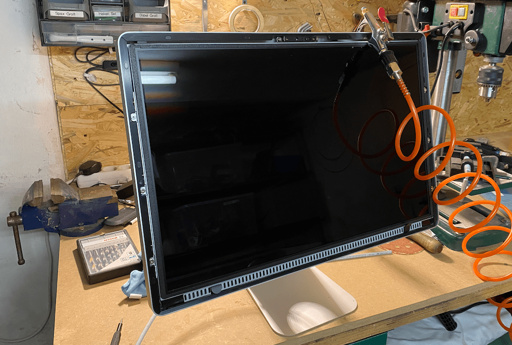 Nach einem kurzem Funktionstest noch eine abschliessende Reinigung sowie die Anbringung der Glasscheibe unter Druckluft, um störenden Staubteilchen im Display vorzubeugen.