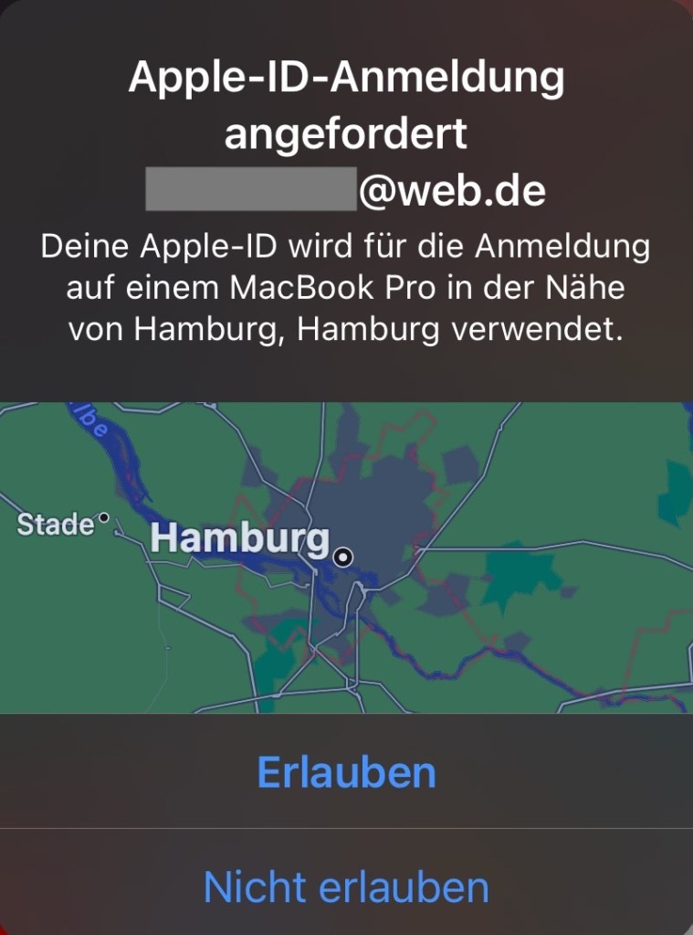 Sobald wir auf „Erlauben“ klicken, folgt ein temporärer 6-stelliger Zifferncode, mit dem wir uns am erstem Gerät authentifizieren können. Der Apple-Server denkt sich nun also „Das wären eine Menge zufälle, die Wahrscheinlichkeit dass diese Anmeldung OK ist ist sehr hoch, also machen wir das!“ & wir sind am erstem Gerät angemeldet.