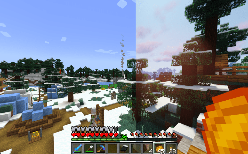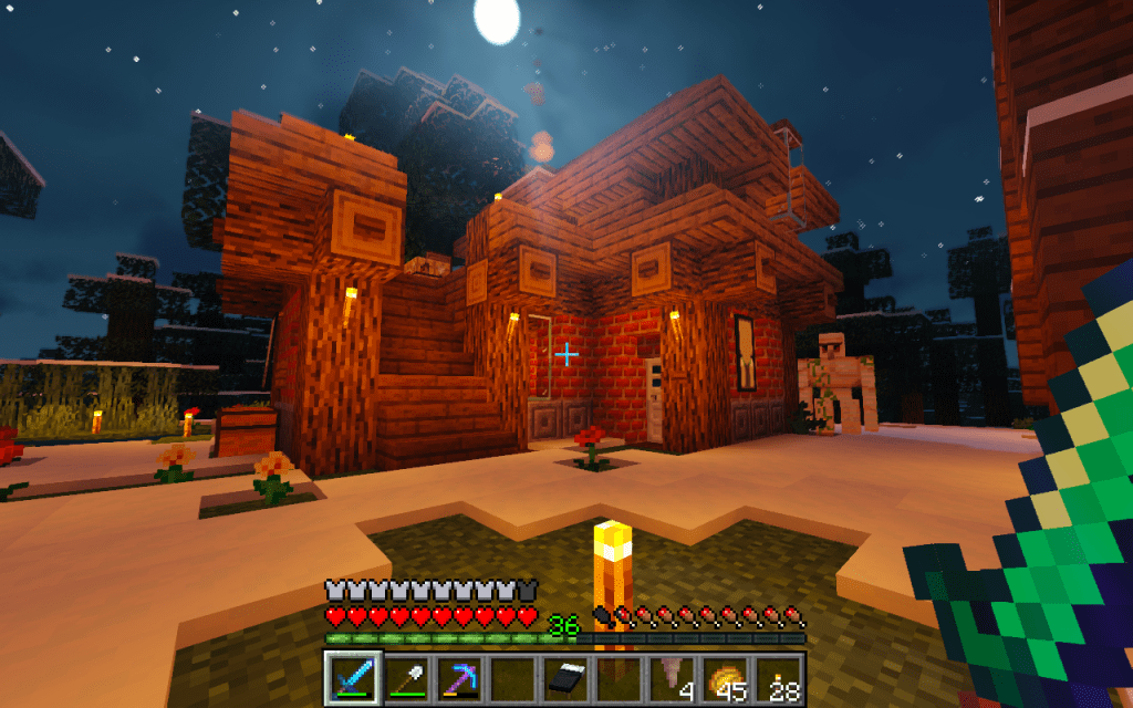 Die erste Nacht ist vorbei, & dir gefällt dein Dach nichtmehr? Runter damit! Soll es ein Flachdach werden? Oder ein Spitzdach? Vielleicht doch ein Obergeschoss? Tja, du brauchst mehr Holz. Soll das Dach eine andere Farbe haben? Dann fälle statt Eichen doch mal Birken. Oder Fichten. Akazien, Schwarzeichen, Tropenbaum….