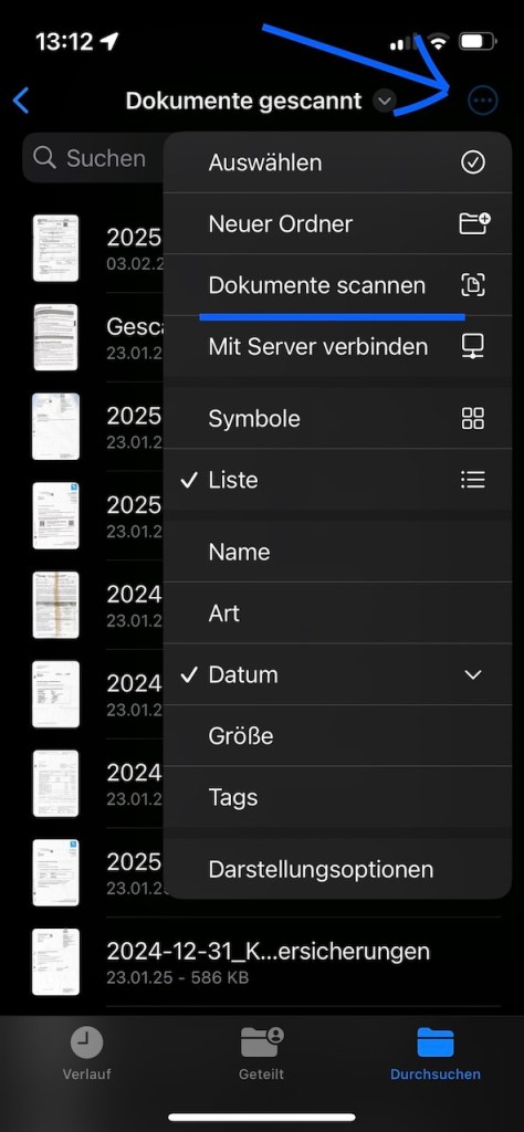 Wir benötigen ein Dokument. Dieses legen wir glatt auf einen gut beleuchteten Tisch & öffnen die „Dateien“-App auf unserem iPhone. Navigiert zu dem Ordner, in welchem Ihr eure Dokumente verwalten möchtet & klickt auf die drei Punkte oben links, anschliessend „Dokumente scannen“: