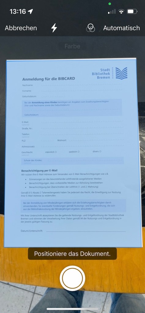Es öffnet sich ein neues Fenster ähnlich der Kamera. Sollte die Auswahl oben rechts auf „Automatisch“ stehen, müsst ihr nur das iPhone über das Dokument halten & warten. Es wird automatisch digitalisiert. Nun können wir weitere Seiten des Dokumentes scannen, indem wir einfach das nächste Blatt nehmen & das iPhone darüber halten. Eine Animation macht uns sichtbar, dass diese Seite gescannt wurde. Alle gescannten Seiten sind unten rechts sichtbar, hier können wir verwaschene Scans löschen & es erneut probieren.